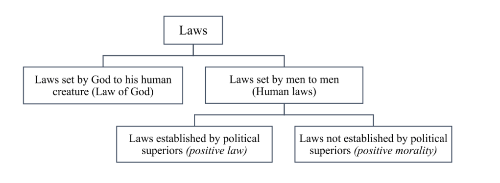 John austin, the father of legal positivism, believed that the term law embraced (1) laws set by god to his human creatures, and (2) laws set by humans to humans. However, he was reluctant to term the former class of laws law of god as laws because of ambiguity. Then, he followed it with a dissection of the laws that are set by humans to humans human laws into positive law and positive morality: